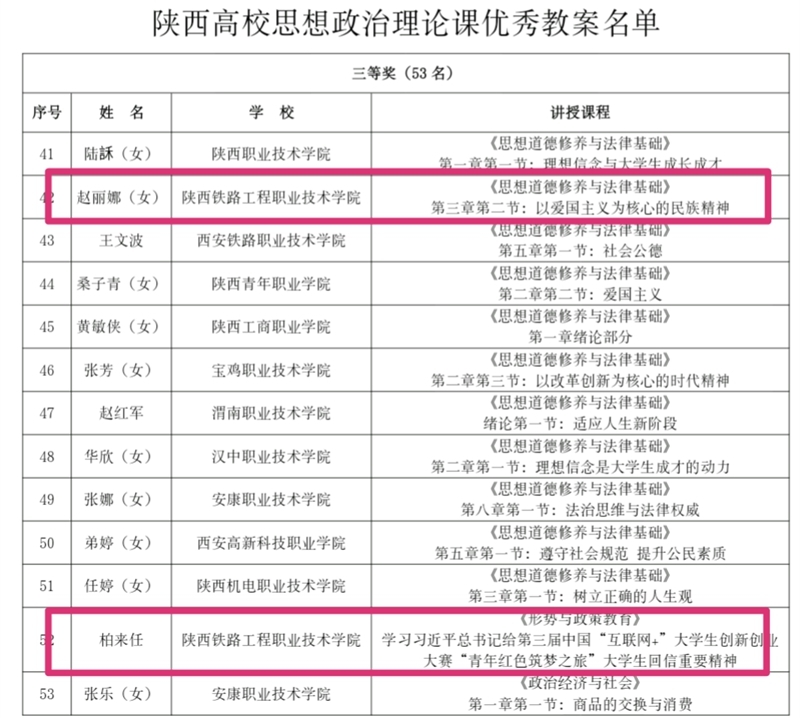 近日,中共陕西省委高教工委下发《关于表彰陕西高校思想政治理论课优秀教案的通报》(陕高教宣〔2017〕24号)文件,学院思政教师赵丽娜的教案《以爱国主义为核心的民族精神》荣获三等奖,柏来任老师的《学习习近平总书记给第三届中国“互联网+”大学生创新创业大赛“青年红色筑梦之旅”大学生回信重要精神》荣获三等奖。本次思想政治理论课优秀教案共有63所高校推荐230份教案参评。经专家评选、会议研究,共确定一等奖6个,二等奖23个,三等奖53个,优秀组织奖9个。