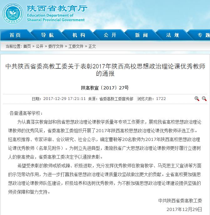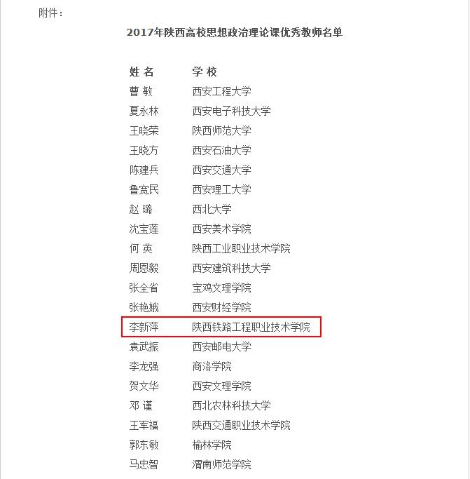李新萍获“2017年陕西高校思想政治理论课优秀教师”称号