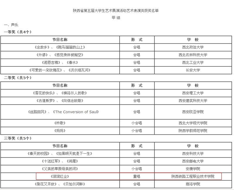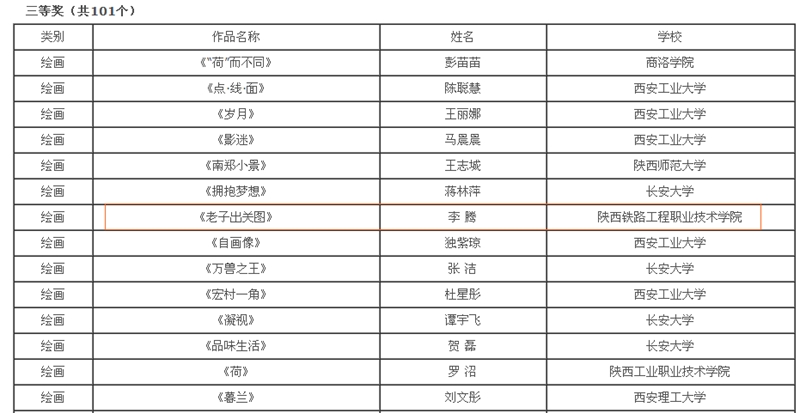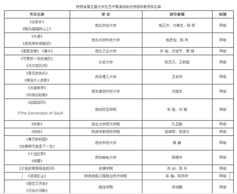 近日,陕西省第五届大学生艺术展演活动结果揭晓,学院郑立洪、彭程两位同学的二重唱《滚滚红尘》和李腾同学绘画作品《老子出关图》荣获甲组艺术表演类艺术作品类三等奖。女生二重唱《滚滚红尘》是本届大学生艺术展演活动中艺术表演声乐类唯一一个由高职院校选送并获奖的节目。张楠、陈莎莎获“优秀指导教师”奖。