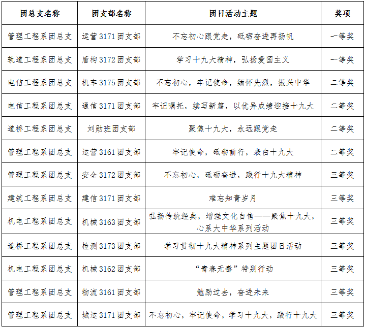 院团委围绕活动主题、活动内容、团员参与度以及媒体宣传,对各级团组织的团日活动进行评选,运营3171等2个团支部获一等奖,机车3175等4个团支部获二等奖,安全3172等7个团支部获三等奖,管理工程系等3个团总支获“优秀组织奖”。(侯峰)