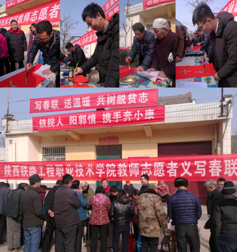 写春联,送温暖,共树脱贫志;铁院人,阳郭情,携手奔小康。1月21日,在学院党委副书记、纪委书记、工会主席杨云峰的带领下,教师志愿者再次走进扶贫结对帮扶的渭南市临渭区阳郭镇,为乡亲义务书写春联,送上铁院人的美好祝福,临渭区委办公室胡斌同志也自告奋勇加入到志愿者的行列。当天正值阳郭镇集市,几位志愿者连续6个多小时,为乡亲们书写了1500多幅春联。一幅幅精彩的书法作品,一句句吉祥如意的春联,既写出了广大村民对美好生活的憧憬和向往,也描绘了大家对脱贫致富坚定信念,乡亲们纷纷称赞陕铁职院让乡亲们赶了一次文化大集。