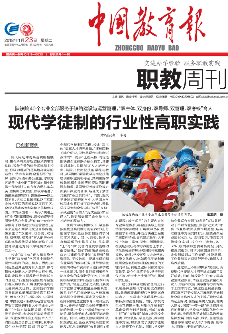 1月23日,《中国教育报》第7版以“现代学徒制的行业性高职实践”为题,对陕西铁路工程职业技术学院近年来不断深化校企合作内涵,探索出“双主体、双身份、双导师、双管理、双考核”育人的行业性高职实施现代学徒制的新路子,进行了大篇幅报道。现将全文转载如下: