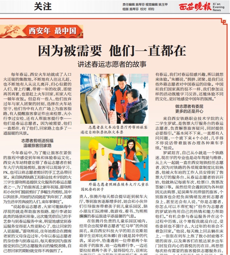 每年春运,西安火车站就成了人口大迁徙的集散地,不断地有人往这儿赶,也不断地有人从这儿离开,归心似箭的人们,背上行囊,带着一年的收获,即使再苦再累,也要赶上火车回家,和家人吃一顿年夜饭。但总有一些人,他们放弃过年与家人团聚的时刻,选择在火车站坚守,他们当中有人在广场上为旅客指路,有人提醒旅客拿证件出来检票、大小行李过安检,还有人帮旅客提行李……他们是春运志愿者。因为被需要,他们一直都在,有了他们,回家路上也多了一道温暖的风景。