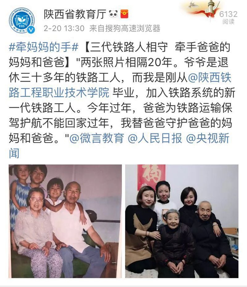 文中写到,“两张照片相隔20年,爷爷是退休三十多年的铁路工人,而我是刚从陕铁院毕业入路的新一代铁路工人。今年过年,爸爸为铁路运输保驾护航不能回家过年,我替爸爸守护爸爸的妈妈和爸爸”。