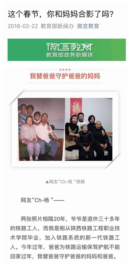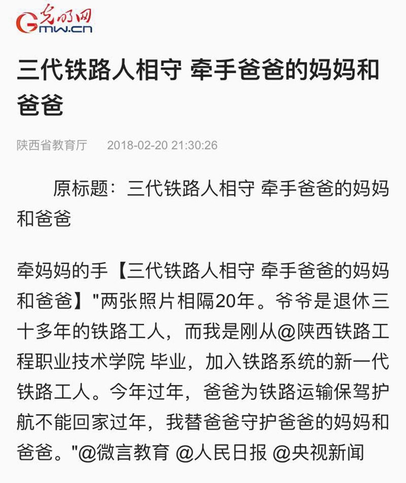 2月22日,教育部官方微信"微言教育"推出“这个春节,你和妈妈合影了吗?”专题,以陕西铁路工程职业技术学院2016届网络系统管理专业毕业生杨歌的家庭20年前后的照片为对比,宣传展示了三代铁路人相守,牵手爸爸的妈妈和爸爸的感人事迹。光明网、陕西省教育厅官方微博也分别进行了宣传报道,在社会上引起强烈反响!