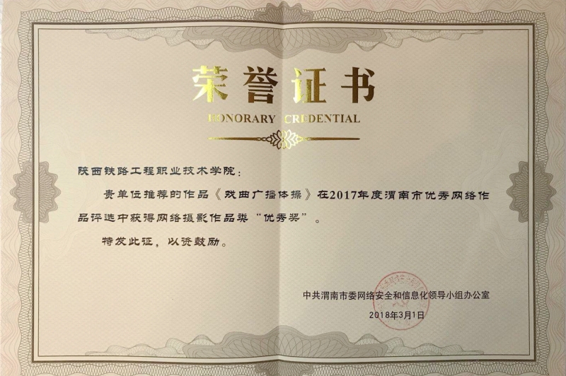3月1日下午,渭南市委召开全市第四届优秀网络文化作品评选表彰大会,对2017年度涌现出的一批体现渭南特色、提升渭南对外形象的优秀网络文化作品进行表彰奖励。学院党委宣传部杨光老师的摄影作品《戏曲广播体操》荣获摄影类优秀奖(该奖项不分等次,只设优秀奖)。