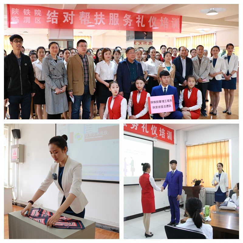 为贯彻落实学院2018年“双百工程”结对帮扶工作计划,充分发挥学院资源优势,助力渭南市临渭区脱贫攻坚。学院于2018年4月4日上午在临渭校区S206、S212、S213对临渭区政府相关部门基层志愿者50余人开展了服务礼仪培训。学院党委副书记、纪委书记杨云峰,扶贫办主任段东旭及管理系相关师生出席了开班仪式。