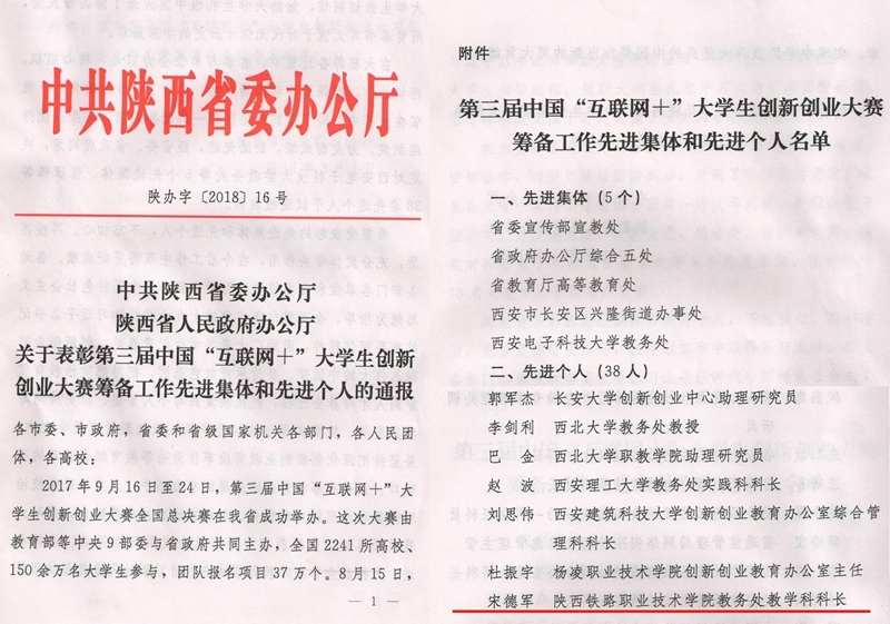 近日,省委办公厅下发《关于表彰第三届中国“互联网+”大学生创新创业大赛筹备工作先进集体和先进个人的通报》(陕办字〔2018〕16号)文件,对第三届中国“互联网+”大学生创新创业大赛筹备工作先进集体和先进个人进行了表彰,学院教务处宋德军同志被评为第三届“互联网+”大学生创新创业大赛筹备工作先进个人。此次在全省范围内共评选出了5个先进集体和38名先进个人,高职院校仅2人。(刘继)文件截图