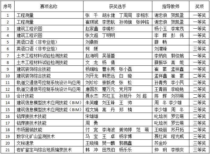 5月2日,陕西省教育厅公布了2018年陕西省高等职业院校技能大赛获奖名单,学院在工程测量、建筑工程识图、英语口语(非专业组)等13个赛项中取得优异成绩,共取得一等奖8项,二等奖7项,三等奖6项,同时,学院在本届技能大赛中获得优秀组织奖。
