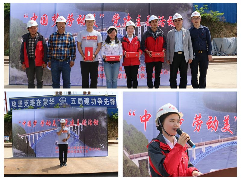 在该项目一工区洛河大桥工地现场,学院一行人听取了企业技术人员对工程施工、管理、技术等情况介绍与讲解,学院两位党员教师、项目部两名党员进行了“中国梦 劳动美”演讲表演,双方领导为演讲选手颁发奖品并合影。学院党员教师杨小玉在现场为大家进行了BIM知识讲座。