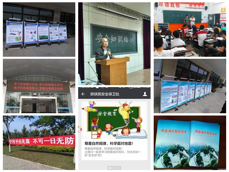 ——精心制作防灾减灾宣传教育展板。为了纪念“汶川地震”十周年,更为了防患于未然,安保处针对地震这一自然灾害精心制作了九块宣传教育展板,内容涉及“地震的产生”“地震的前兆”“地震的基本常识”“地震时公共场所如何个人保护”“地震应急时应注意什么”“校园避震秘笈”“震后被压如何自救”“地震时如何互救”“地震时的十条须知”等九个方面。另外还围绕“地震”“洪涝”“高温”“台风”“雾霾”“雷电”“雪灾”“冻灾”“山体滑坡”等九类常见自然灾害制作了相应的宣传教育展板。