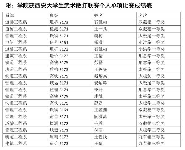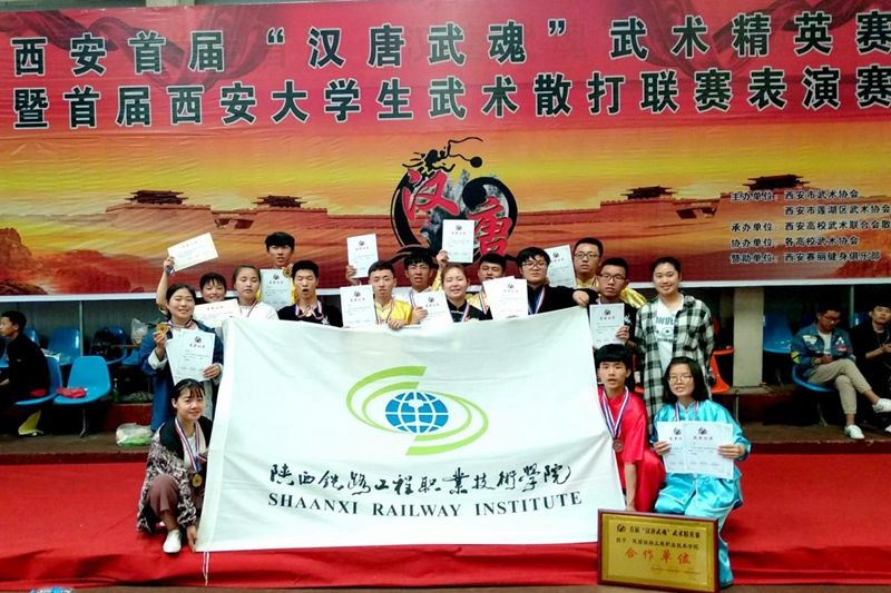 学院武术队从不同系部选拔的16名学生参加了本次比赛,由张骏老师领队,任飞老师担任教练。在学院和体育部的领导的大力支持下,学院武术队与全省30余所高校武术运动员同台竞技,在比赛中发扬“吃苦奉献,拼搏争先”的铁院精神,最终获得集体项目团体一等奖,男子、女子单器械类和男子、女子拳术类一等奖的好成绩,同时学院被比赛主办方西安市武术协会、西安高校武术联合会授予赛事合作单位。(任飞)