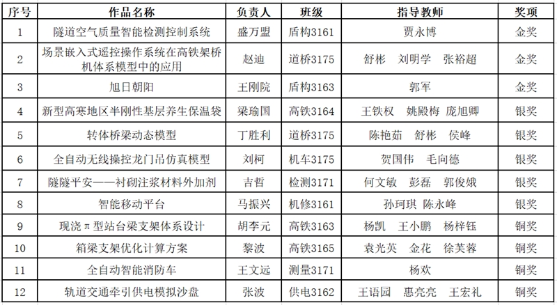 本次大赛共设置金奖23项、银奖40项、铜奖60项,来自全省的21个高职院校的216个项目参加了比赛。大赛自5月底启动以来,院团委认真筹备、组织申报,经过宣传动员、集中培训、填写申报书以及在线审核,最终遴选出16件作品报送省赛。其中轨道工程系盛万盟等同学的《隧道空气质量智能检测控制系统》、道桥工程系赵迪等同学的《场景嵌入式遥控操作系统在高铁架桥机体系模型中的应用》、轨道工程系王刚院等同学的《旭日朝阳》等3件作品获得金奖;《新型高寒地区半刚性基层养生保温袋》等5件作品获得银奖;《现浇π型站台梁支架体系设计》等4件作品获得铜奖。