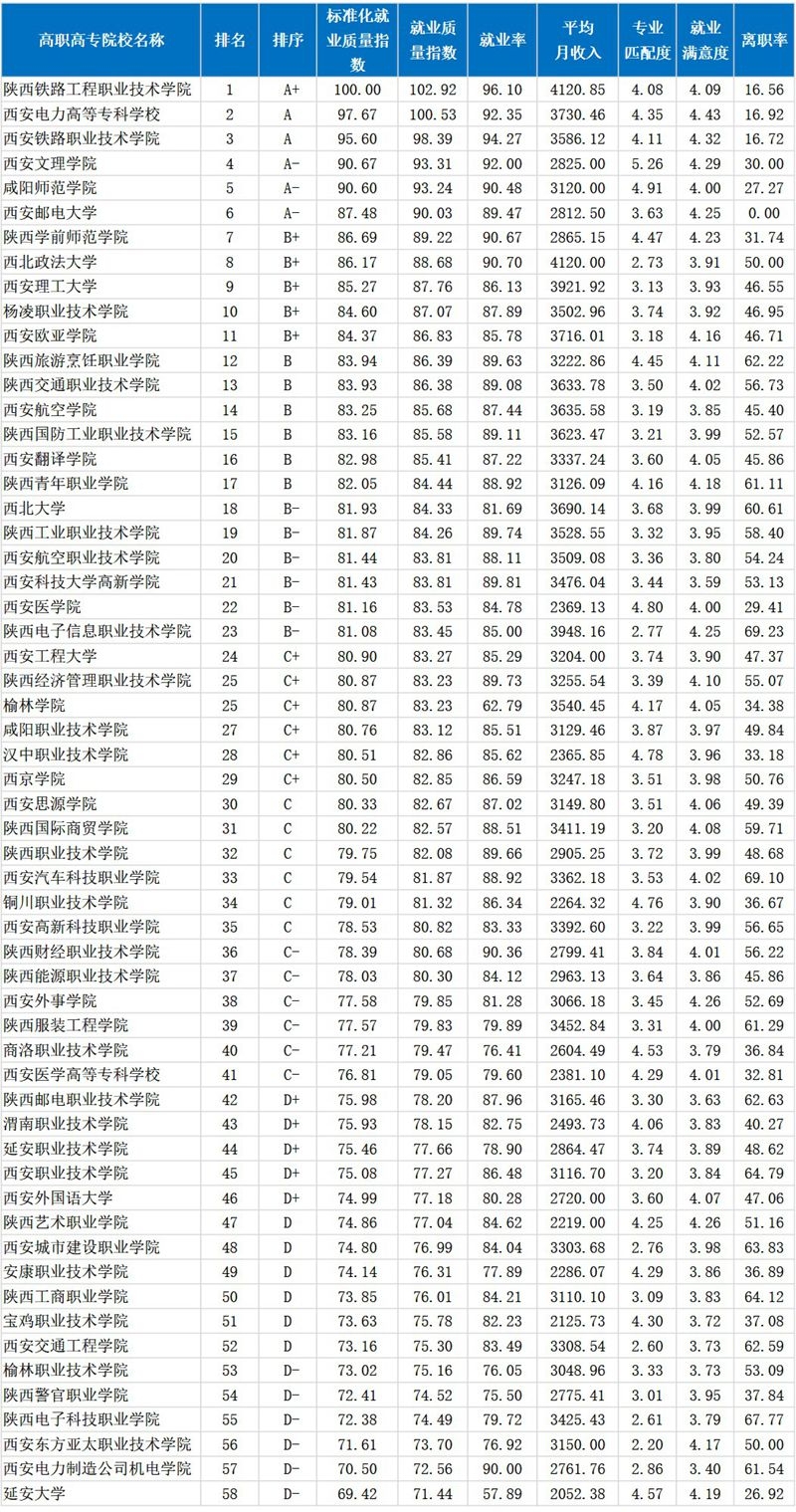 6月26日,《2018年陕西高校及专业毕业生就业质量指数评价报告》发布,陕铁院在全省58所高职高专院校中,是唯一一所就业质量评定等级为A+的院校,位居全省高职高专第一名,就业率及平均月收入均为第一。