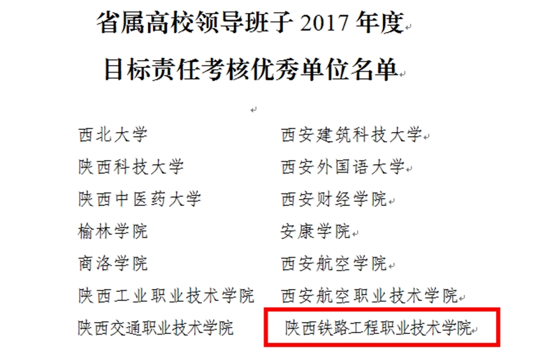 8月23日,中共陕西省委组织部、中共陕西省委高教工委印发《关于表彰省属高校领导班子2017年度目标责任考核优秀单位的通报》(陕高教组〔2018〕99号)文件,对2017年度目标责任考核优秀等次的高校进行了通报表彰。学院连续四年被评为省属高等学校领导班子年度目标责任考核优秀单位。