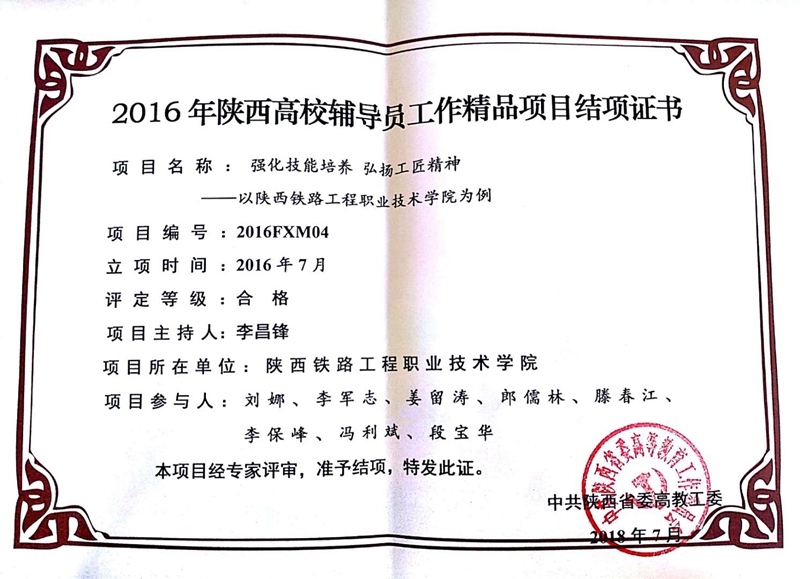 近日,陕西省委高教工委公布了“2016年度陕西高校辅导员工作精品项目”结项名单,学院李昌峰老师主持的《强化技能培养,弘扬工匠精神——以陕西铁路工程职业技术学院为例》经过2年的精心培育,实现了预期目标,经专家评审,验收合格,顺利结项。
