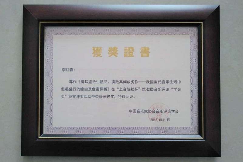 学院教师李红春撰写的《掩耳盗铃生赝品、凑数其间成劣作——我国当代音乐生活中假唱盛行的缘由及危害探析》,全文13115字,运用音乐学、传播学、社会学、心理学、管理学相关理论知识,从“文化产业化大背景下的声乐表演”、“平民偶像崇拜中的音乐造星风潮”、“声乐的现场性与艺术传播之关系”、“歌手群体的道德修养和自身责任”、“艺术演出市场管理的理想与现实”五个方面深入论述了我国当代音乐生活中,在卫视频道、现实舞台、网络媒体中假唱盛行的深层原因和巨大危害。