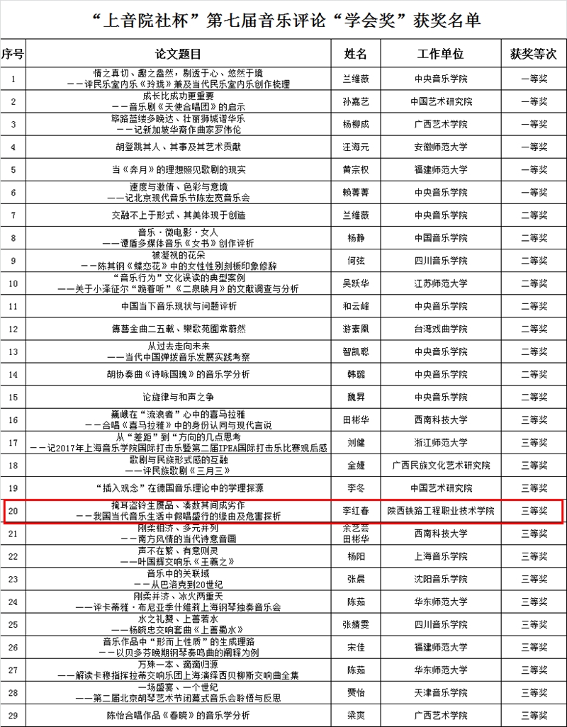 10月25日,由中国音乐家协会音乐评论学会主办、上海音乐学院承办、上海音乐学院出版社冠名的“上音院社杯”第七届音乐评论“学会奖”征文比赛在上海举行。学院教师李红春在比赛中获得三等奖,这是学院教师第二次获得此项殊荣,也是全国高职院校第二次获得此项殊荣(第一次:2015年12月,李红春撰写的《聂耳应该是什么家——与王西麟先生商榷》获得中国音乐家协会音乐评论学会第五届学会奖二等奖)。