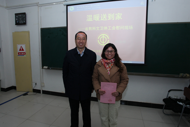 陈建树一行走访慰问了陕西省“特支计划”教学名师张福荣、2018年陕西省师德先进个人史芳及4名因本人或直系亲属患大病的教职工,为他们送上了省教科文卫体工会慰问信和慰问金。