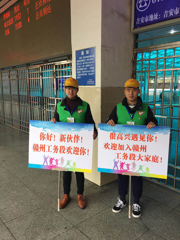 本报南昌1月20日电 (记者陈南辉 通讯员杨莹青)1月12日下午,来自河南永城的小伙子朱海龙和来自安徽潜山的小伙子叶涛乘火车到达吉安站。下车后,二人受到赣州工务段工作人员的热情接待。