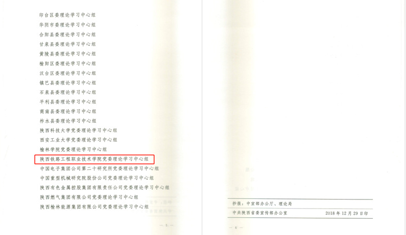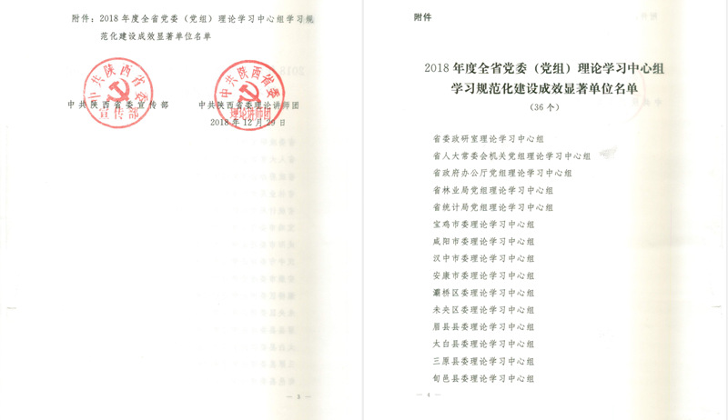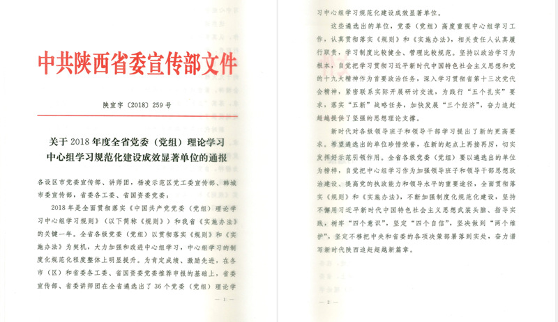 近日,中共陕西省委宣传部印发了《关于2018年度全省党委(党组)理论学习中心组学习规范化建设成效显著单位的通报》文件,学院党委理论学习中心组被授予“2018年度全省党委(党组)理论学习中心组学习规范化建设成效显著单位”,全省仅4所高校获此殊荣。
