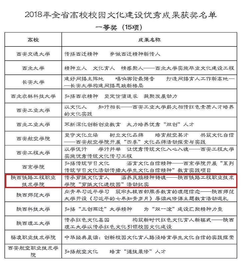 1月30日,中共陕西省委教育工委印发了《关于表彰2018年全省高校校园文化建设优秀成果的通报》文件,陕西铁路工程职业技术学院《传承剪纸文化育人 涵养民族精神铸魂——陕西铁路工程职业技术学院“剪纸文化进校园”活动纪实》校园文化成果荣获陕西省校园文化建设优秀成果一等奖。这是自2009年以来,学院第8次捧回一等奖!