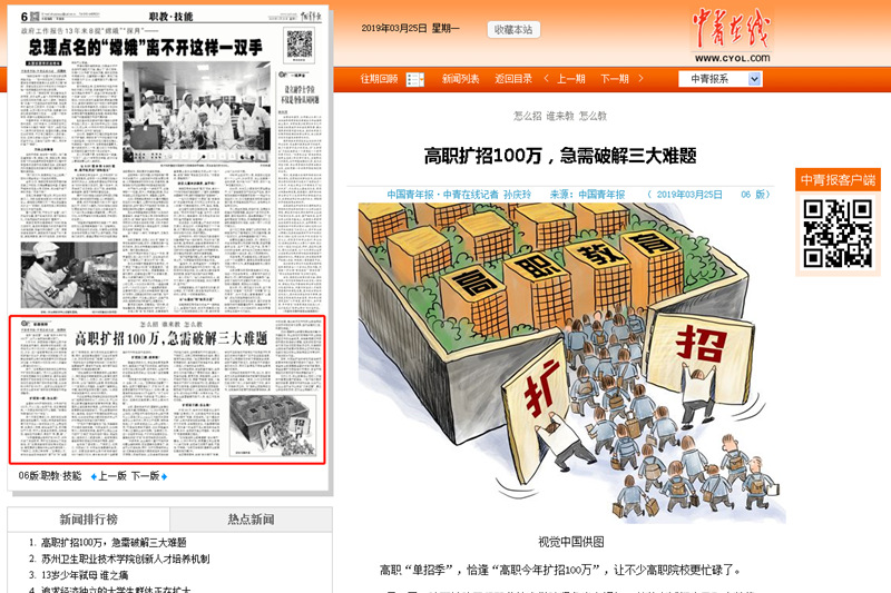 2019年3月25日,《光明日报》第8版以“陕西:教师‘大练兵’激活思政课堂”为题,《中国青年报》第6版,以“高职今年扩招100万,急需破解三大难题”为题,分别报道了学院结合行业教育资源,充分挖掘育人元素,形成了“两融入”思政课品牌项目的办学成果,以及积极响应国家“高职扩招100万”的消息。现将原文转载如下: