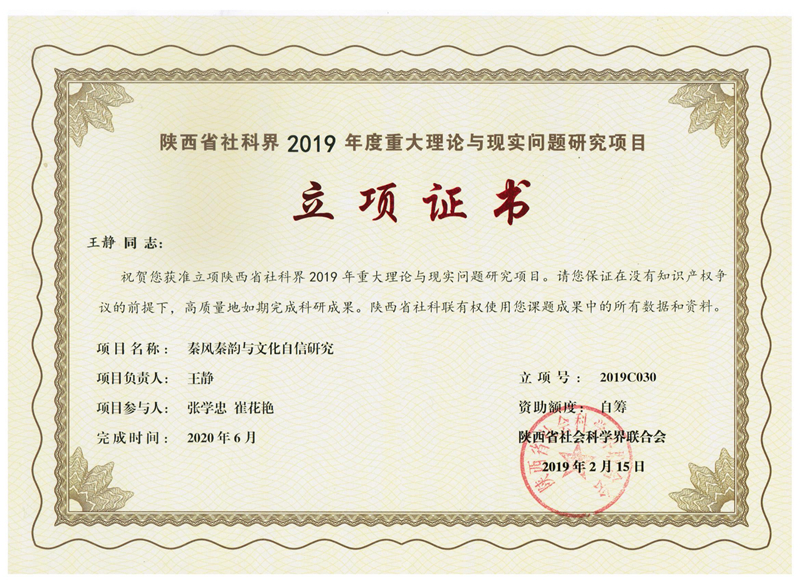 立项证书 近日,陕西省社会科学界联合会公布了《关于2019年陕西省社科界重大理论与现实问题研究项目立项结果的通知》(陕社科联【2019】12号)文件,学院继续教育部王静申报的《秦风秦韵与文化自信研究》获立项,实现了学院在陕西省社会科学界联合会立项零的突破。 2019年度陕西省社科界重大理论与现实问题研究项目共立项400项,其中一般项目200项,自筹经费项目200项。(赵晓玉)