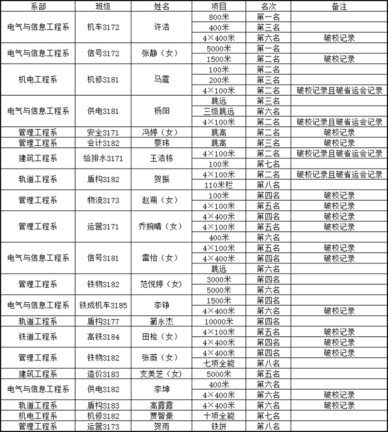 参赛学生合影留念 5月19日至22日,由陕西省教育厅主办,陕西省学生体育协会、西安交通大学承办的陕西省第四十一届大学生田径运动会在西安举行,来自全省85所院校的近2000名运动员参加了3个组别的比赛。 学院派出21名运动员参加了丙组比赛,运动健儿在比赛中顽强拼搏、奋勇争先,表现出了良好精神风貌和体育精神。共夺得两枚金牌、四枚银牌、四枚铜牌,男子团体第三、女子团体第四、男女团体第四的优异成绩、并打破1项省大学生运动会记录,荣获道德风尚奖。(张增光)比赛成绩