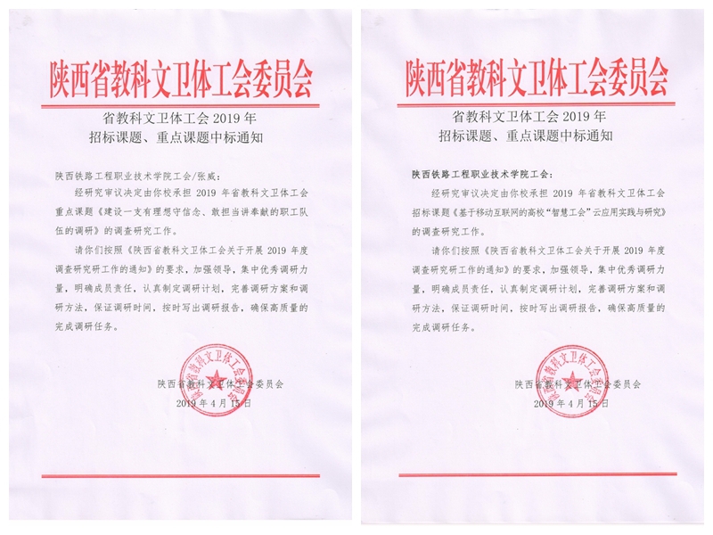 近日,陕西省教科文卫体工会公布了陕西省教科文卫体工会2019年调查研究招标、重点课题中标名单,学院杨云峰教授主持的招标课题《基于移动互联网的高校“智慧工会”云应用实践与研究》(项目编号:19ZB001),张威老师主持的重点课题《建设一支有理想守信念、敢担当讲奉献的职工队伍的调研》(项目编号:19ZD002)获批立项,此次立项重点课题共计12项。以上两课题的立项是学院在全省工会系统理论研究与实践应用相结合的调查研究中的重大突破。(赵晓玉)文件截图