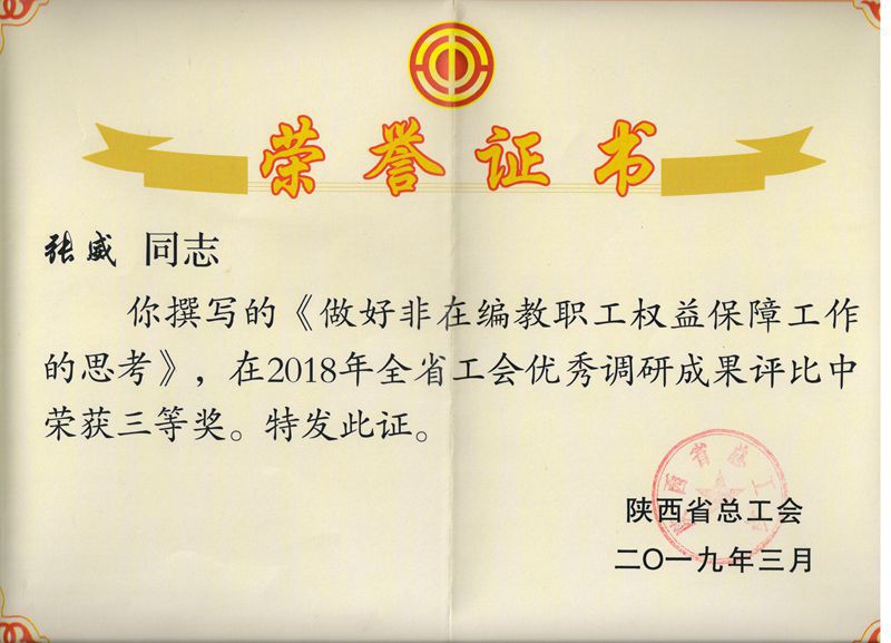 获奖证书 近日,陕西省总工会发布了陕工办发〔2019〕11号《关于2018年全省工会优秀调研成果评比情况的通报》,学院张威老师撰写的论文《做好非在编教职工权益保障工作的思考》获全省优秀调研成果三等奖。 近年来,学院工会组织工会积极分子广泛开展工运理论研究和调查研究工作,为推动工会工作改革创新发挥了重要作用。(黄跃翔)