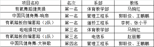 学院代表队参加了丙组比赛的6个项目,获得三项第一名,两项第三名,一项第四名,团体第五名的好成绩。其中,第一名是中国风健身舞响扇(教练:郭联俊、王鹏鹏),有氧舞蹈健美操(教练:马婉红),有氧踏板自编套路(教练:李树、张小平);第三名是有氧踏板自编套路(教练:赵丽娜),啦啦操花球(教练:马婉红),第四名是中国风健身舞大秧歌(教练:郭联俊、王鹏鹏)。另外,电信系信号3171班杨紫焜同学获得优秀运动员,马婉红获得优秀教练员。(任文)