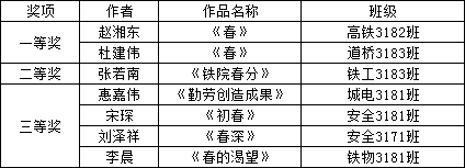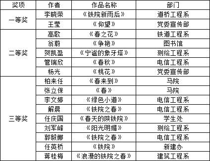 近日,由党委宣传部举办的第六届“最美陕铁院”之“铁院之春”摄影大赛结果出炉,大赛分为教师组和学生组,经专家组评审,共评出教师组一等奖2名,二等奖5名,三等奖9名;学生组一等奖2名,二等奖1名,三等奖4名。