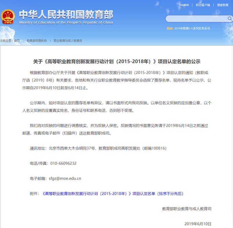 《高等职业教育创新发展行动计划(2015—2018年)》是国家引领高职教育发展的重大举措,是职业教育改革发展的路线图,学院共承担40个任务和13个项目(40个子项目)建设任务。此次学院17个项目通过教育部认定,是对学院三年来在优质校、骨干专业、生产性实训基地、技能大师工作室等方面建设成效的充分肯定,展现了学院求真务实、改革发展的良好态势。学院将以此为契机,进一步深化产教融合,扩大国际合作,激发教育教学改革活力,不断提升人才培养质量,助力“双高”建设。(刘继)