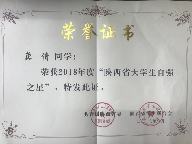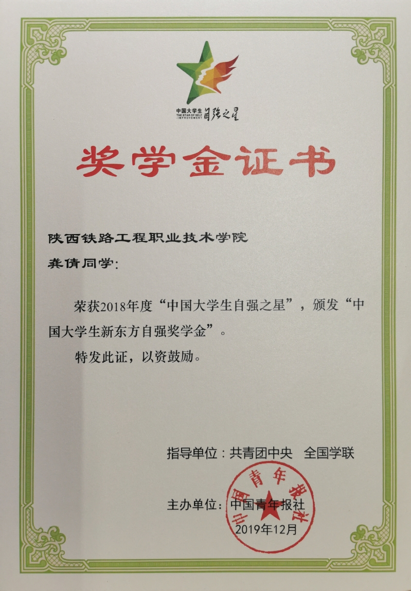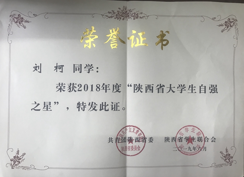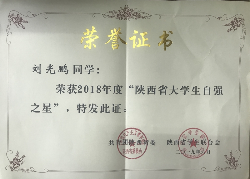 近日,由共青团中央、全国学联主办,的2018年度寻访“中国大学生自强之星”活动结果揭晓,100名大学生获评“陕西省大学生自强之星”,其中学院检测3171班刘光鹏、机车3175班刘柯、建信3171班龚倩三名同学位列其中。