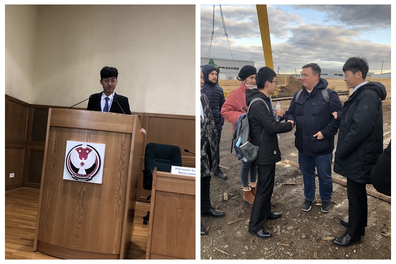 李铮在伊热夫斯克市政府大厅进行创业项目交流(左图),王鹏飞与当地企业负责人交流创业经验(右图)