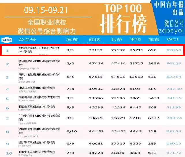 全国职业院校微信公众号影响力排行榜(9月15日-9月21日)部分节选