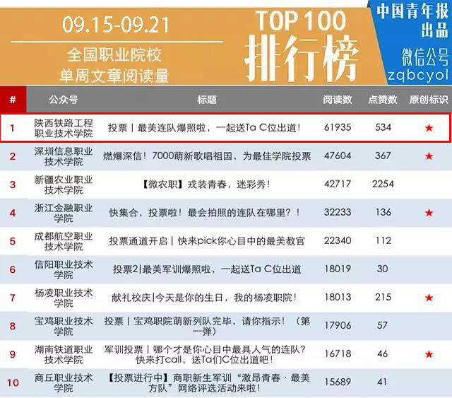 9月24日,中国青年报官微发布了全国职业院校微信公众号影响力排行榜(9月15日-9月21日),学院官微位居全国第1位,其中“投票丨最美连队爆照啦,一起送Ta C位出道!”阅读量突破60000+位列全国职业院校单周文章阅读量榜单第一名,也是学院官微推文的阅读量首次突破6w+。