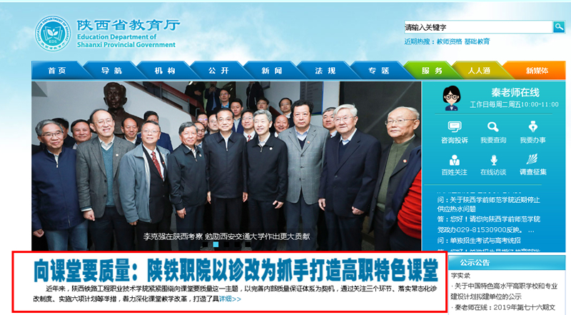 10月29日,陕西省教育厅门户网站头条以“向课堂要质量:陕铁职院以诊改为抓手打造高职特色课堂”为题,报道了学院深化课堂教学改革,有力促进了人才培养质量的全面提升的消息。现将原文转载如下,欢迎大家浏览: