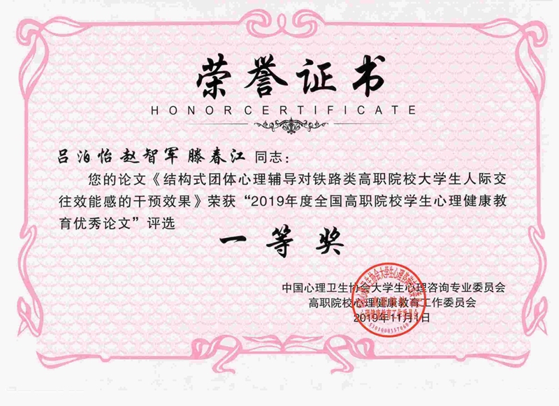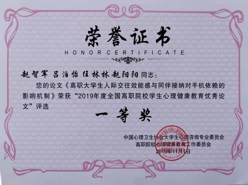 在“2019年度全国高职院校大学生心理健康教育优秀论文”评审中,学院赵智军老师《高职大学生人际交往效能感与同伴接纳对手机依赖的影响机制》荣获优秀论文一等奖;吕泊怡老师的论文《结构式团体心理辅导对铁路类高职院校大学生人际交往效能感的干预效果》荣获优秀论文一等奖,其中一等奖共13篇,二等奖26篇,三等奖53篇。吕泊怡老师受邀作大会优秀学术论文交流发言。