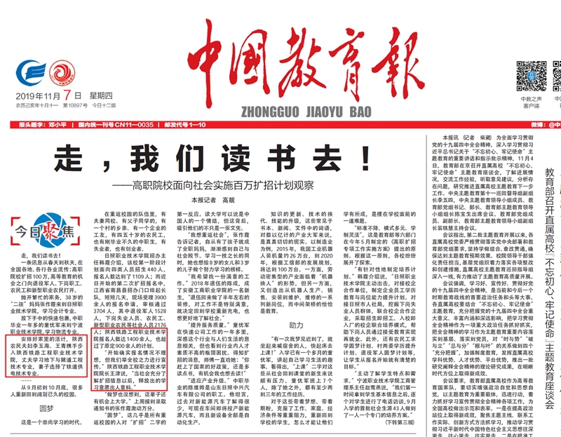 2019年11月7日,《中国教育报》在头版头条位置处,以“走,我们读书去!——高职院校面向社会实施百万扩张计划观察”为题,对国家百万扩招计划的实施情况进行了报道,文章将学院扩招中90后夫妻双双选择陕铁院圆了大学梦的故事列为典型案例,结合对王津院长的采访,报道了学院落实高职扩招百万计划取得的成效,学院为陕西唯一接受采访报道的高职院校。现将原文转载如下,欢迎大家浏览: