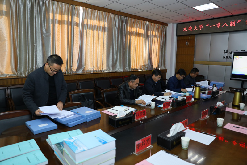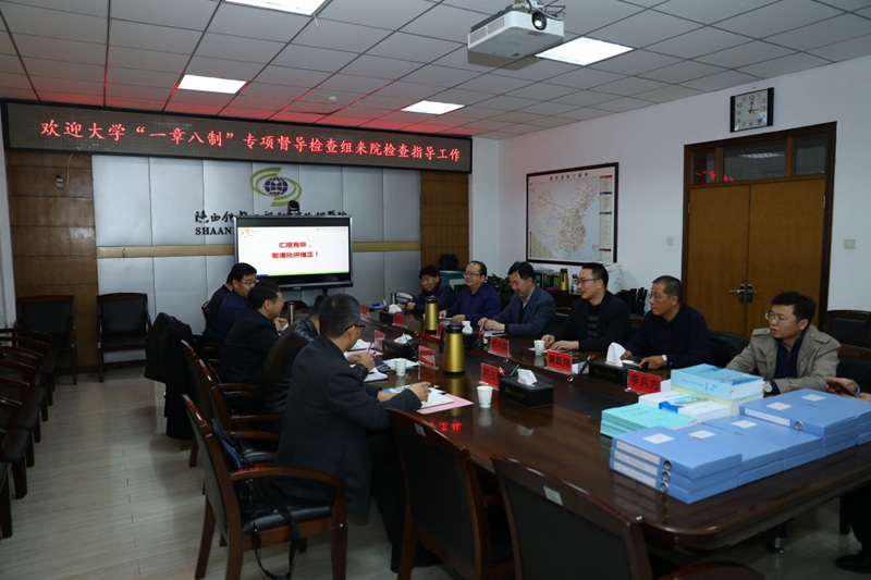 为进一步推动建立完善现代大学制度、推进治理体系治理能力现代化,2019年12月10日,由陕西省政府教育督导委员会办公室副主任任正旺、延安大学党委书记张金锁、西安工程大学副校长王进富、陕西师范大学教育学院教育法治研究中心主任祁占勇、陕西学前师范学院教学质量监控与评估处处长杨令平组成的“一章八制”专项督导检查组,来我院检查指导工作。在临渭校区11楼会议室,召开了“一章八制”专项督导检查座谈会。学院院长王津,党委(院长)办公室、校企合作处、院工会、科技处、财务处等部门负责人参加了座谈会。