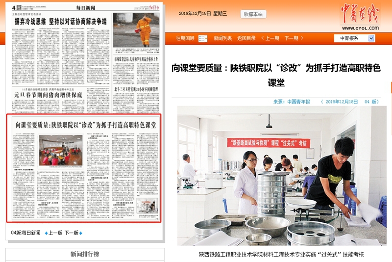 12月18日《中国青年报》第4版以“向课堂要质量:陕铁职院以“诊改”为抓手打造高职特色课堂”为题,大篇幅报道学院课堂教学创新成果。现将原文转载如下,欢迎大家浏览: