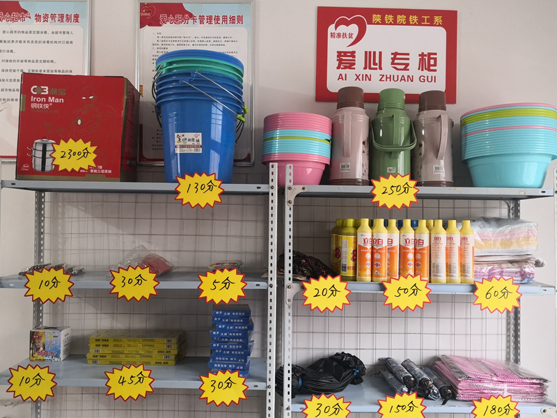 会后一行人参观“爱心专柜”,徐韩村将铁工系赠送的日用品建立“爱心专柜”,以积分奖励的形式发放给贫困户,以奖励机制促进徐韩村扶贫工作的开展。(原亚会)