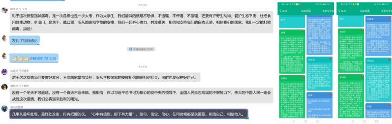 机电3171班谭凯:经过一堂思政课的教导,我明白了许多,这不仅仅是堂课,更是对我们人生的引领。特别是最后一个老师讲到为了一个孩子让一个团去战斗的故事真的有点感动,疫情疫情,疫中有情,疫情隔离不了爱,共同构建战“疫”共同体,我们虽然不能“亲近战场”,但是我们永远是国家、武汉的后勤部队。中国加油!武汉加油!钟院长加油!希望疫情早点结束,疫情过后的祖国会更加美好!