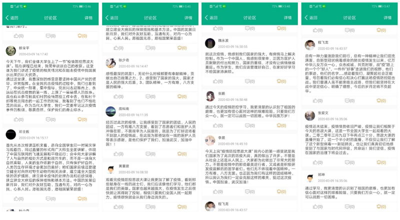 观看完课程直播后,同学们讨论着自己的收获和感悟。有的为中国共产党的正确领导和祖国的强大而骄傲自豪,有的为全国人民的团结一致而无比感动,有的向疫情一线的工作人员表示感谢,有的认识到人与自然和谐相处的重要。希望他们在以后能像课堂中提到的此次抗疫主力军之一——“90后”一样,担当着属于“00后”的时代责任和历史使命,在祖国的广袤大地上实现他们的人生理想!(张肖)