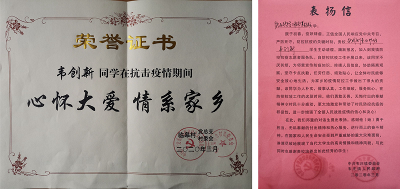 近日,渭南市澄城县韦庄镇人民政府发来表扬信,对学校测绘与检测学院2019级铁成测量3199班学生韦创新同学在家乡疫情防控工作中的突出表现予以表彰和感谢。