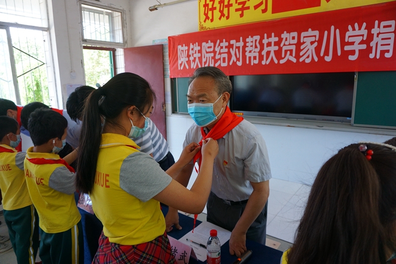 活动中,临渭区教育局邢唯远致欢迎词,他代表临渭区教育系统和在场全体师生对陕铁院党委副书记车绪武一行的到来表示热烈欢迎,对学校爱心捐赠表示衷心的感谢。活动现场,嘉宾们为孩子们捐赠了书包、文具等学习生活用品。阳郭镇贺家小学的少先队员们为嘉宾们佩戴了红领巾。临渭区副区长张占权在讲话中感谢学校的爱心帮扶和对临渭区教育事业的关心与支持,并表示今后双方将加强沟通和联系,积极推进扶贫工作,把教育扶贫各项举措落到实处。