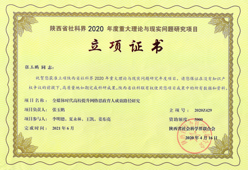 近日,陕西省社会科学界联合会公布了2020年陕西省社科界重大理论与现实问题研究年度项目立项结果。党委宣传部张玉鹏同志主持申报的课题《全媒体时代高校提升网络思政育人成效路径研究》获批立项,并给予资助经费5000元。这是学校首次获得省社科联项目经费资助支持,也是学校在网络思政育人工作中取得的一项重要突破。
