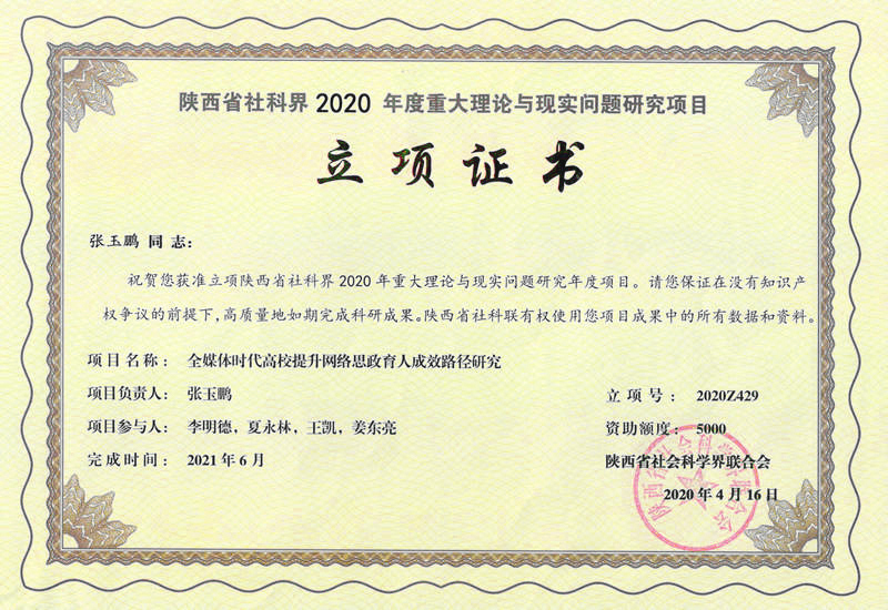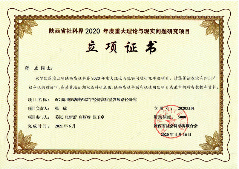 近日,陕西省社会科学界联合会公布了《关于公布2020年陕西省社科界重大理论与现实问题研究年度项目立项结果的通知》(陕社科联【2020】20号)文件,我校马克思主义学院副教授张威主持申报的课题《5G商用推动陕西数字经济高质量发展路径研究》、宣传部副部长张玉鹏主持申报的课题《全媒体时代高校提升网络思政育人成效路径研究》获批立项,并分别给予资助经费0.5万元。实现了学校在陕西省人文社科领域重大理论与现实问题研究新的突破。(赵晓玉)